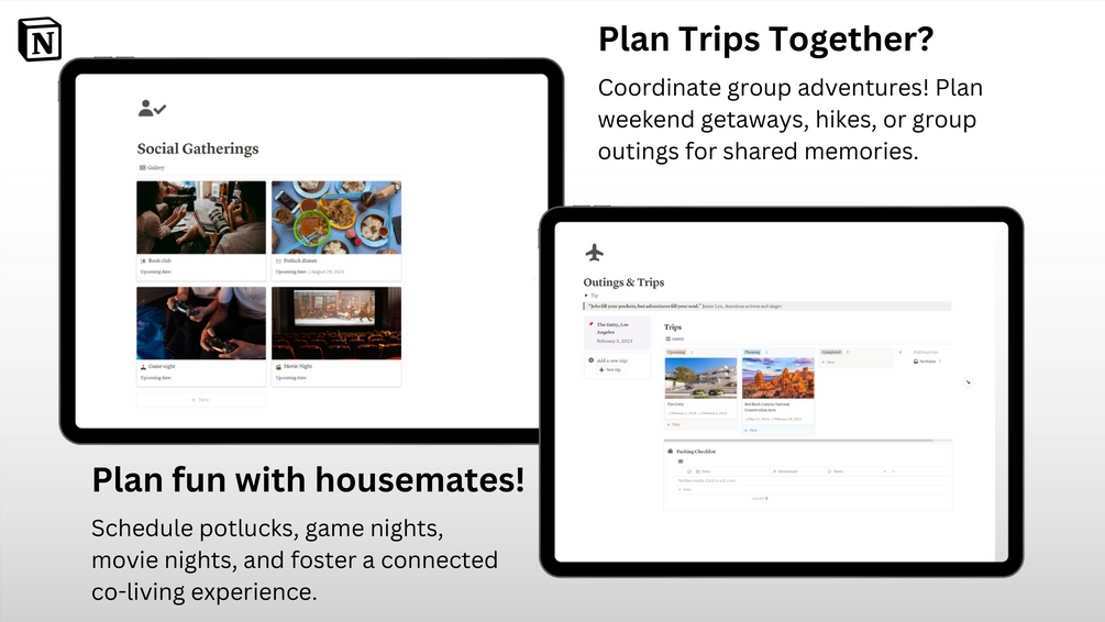 π Outings & Trips: Easily organize trips, adventures, and outings with your roommates. Along with exploring new locations, make sure you don't forget anything by keeping an eye on the packing checklist.